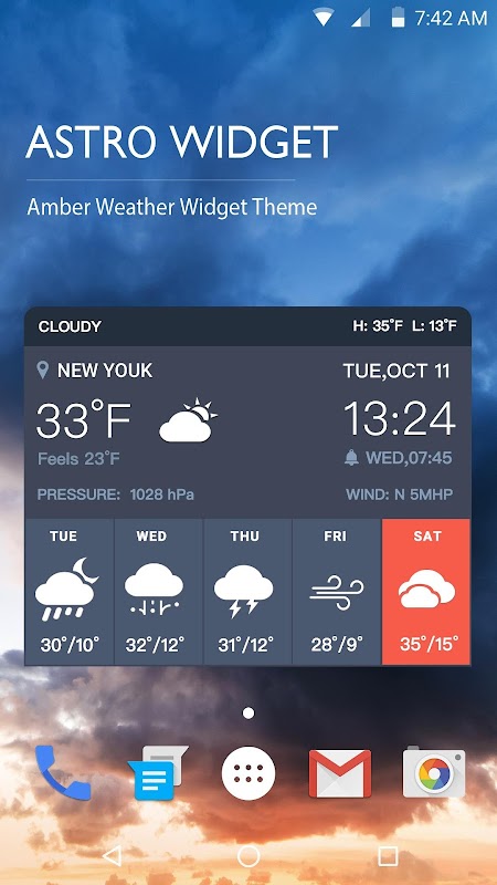 In this daily and hourly weather app, you can get more than just temperatures and clock. You can check humidity, visibility, UV index, air pressure, wind speed, sunrise time, sunset time in different units.