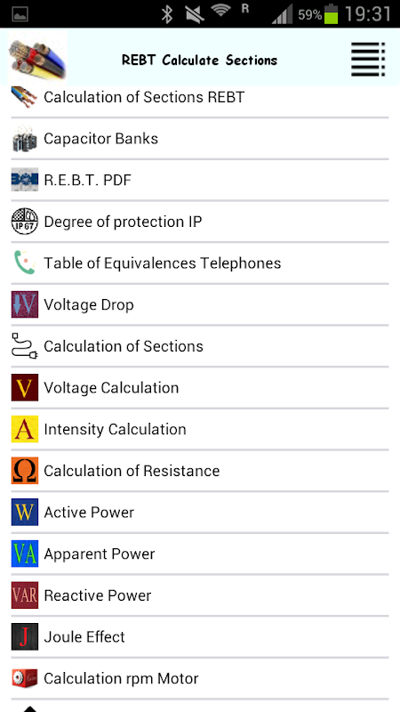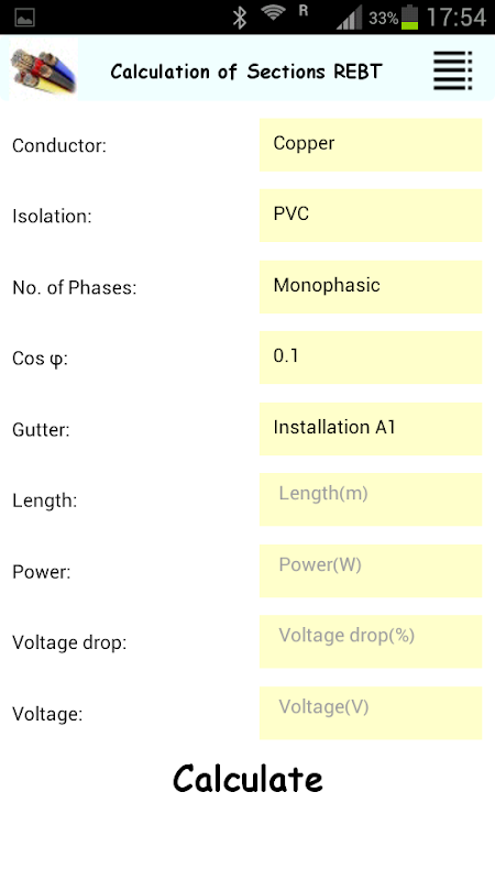 This application has been developed to calculate the cross section of the electrical conductors by voltage drop (cdt) depending on the length and the conductor ampacity as defined in the Regulation for Low Voltage (REBT).
