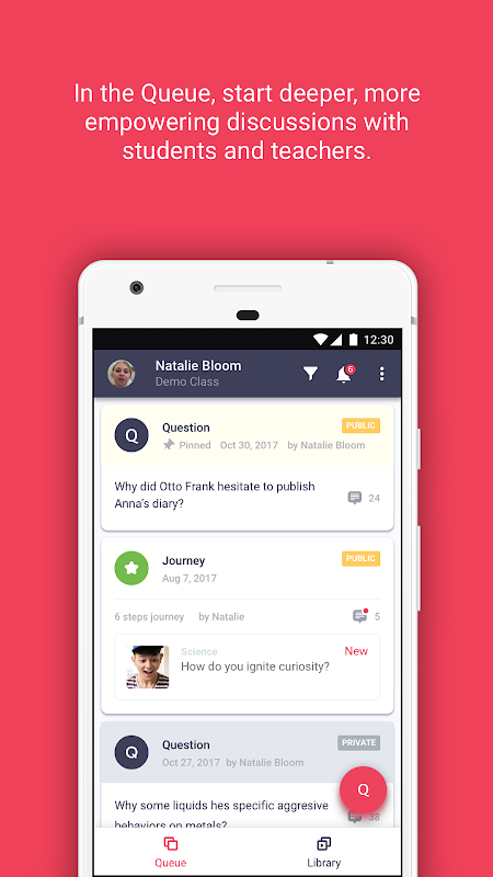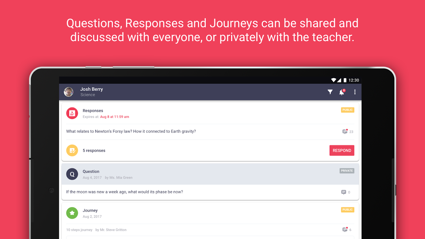 App capabilities includes the ability to view Journeys, respond to questions with chat and video, and ask questions for private and public discussion. All actions get prompted within the app, and are setup from the teacher account accessed through the web.