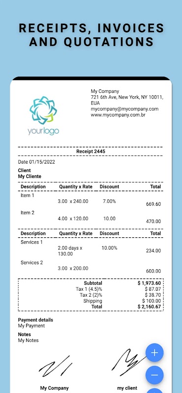 Add the signature of your company and your customers to the receipt, invoice, estimate and credit notes.