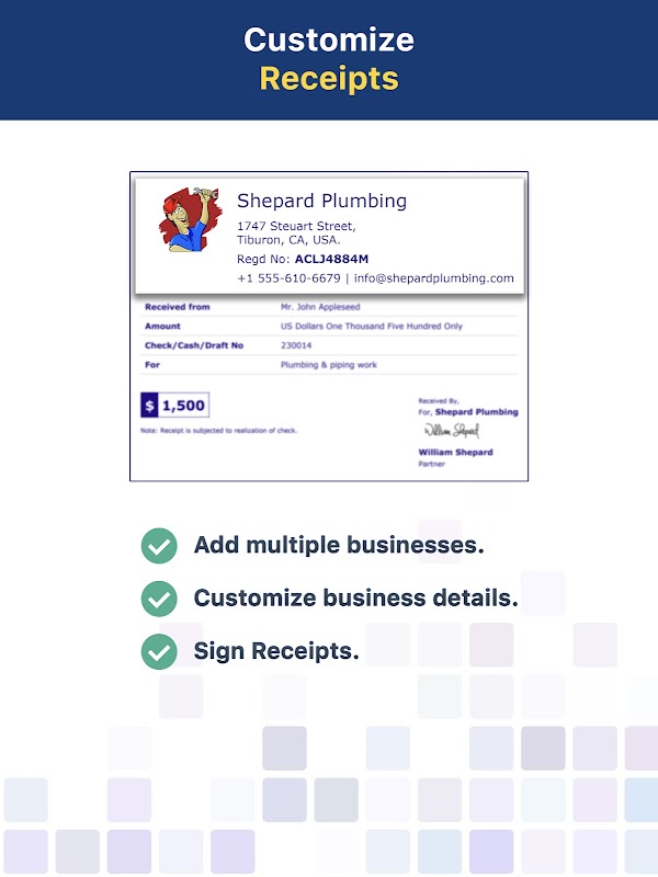 With the Receipt Maker app, you can create customized receipts and print, email, SMS, or share them. You can sign these receipts and send them to your customers with a single tap. Make the receipt with minimal information like customer name, service, amount, payment method, and receiver name.