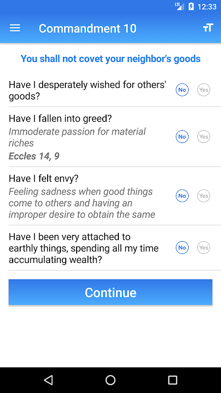 Reconciliation is the application that allows you to perform a complete examination of your conscience through a series of simple questions related to each of the commandments allowing you to obtain a clear vision of the faults committed according to the Bible and the commandments according to God´s law. Once the exam is completed the result is saved and can be easily retrieved for reflection and to serve as a guide in your next Catholic confession.