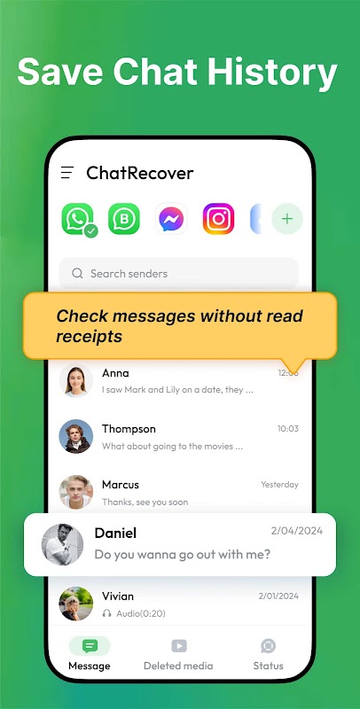 Stay in control of your conversations by reading messages privately without being seen. Plus, with our fantastic status saver, you can download, view, and share your favorite statuses in just one tap! Efficient, secure, and convenient—ChatRecover ensures you stay on top of every important message!