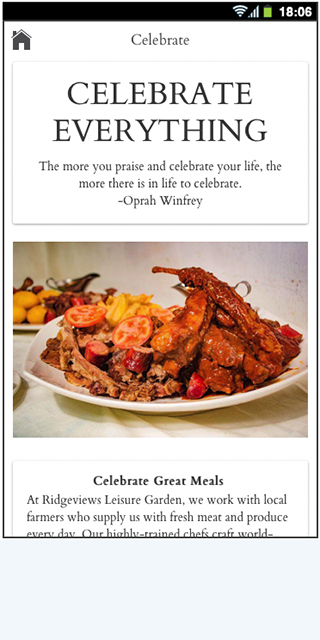 At Ridgeviews Leisure Garden, we work with local farmers who supply us with fresh meat and produce every day. Our highly-trained chefs craft world-class meals for any occasion. Whether for two or for groups, we are well suited to host you. Our dining facilities are designed for private celebrations, corporate events, informal meetings and special occasions. With an emphasis on exceptional customer service, Ridgeviews’ professional staff will cater to you in a warm, inviting and relaxed atmosphere. Check out our menu featuring various meal options for meat-lovers and vegetarians alike.