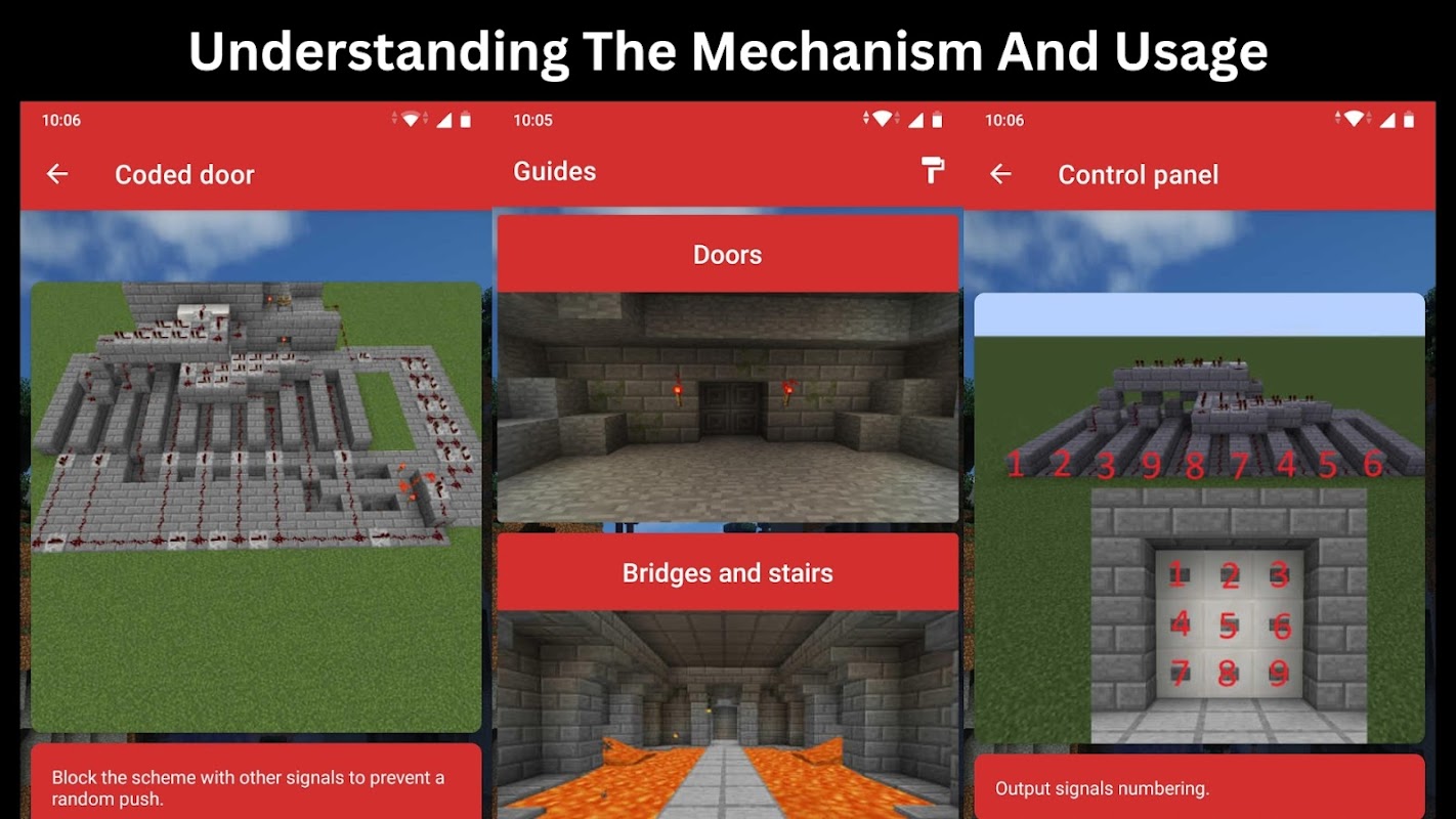 The app also includes detailed tutorials on some of the most popular redstone builds, such as automatic item sorters, redstone clocks, and hidden doors. You can follow along step-by-step, or use the app as a reference guide when building your own creations.