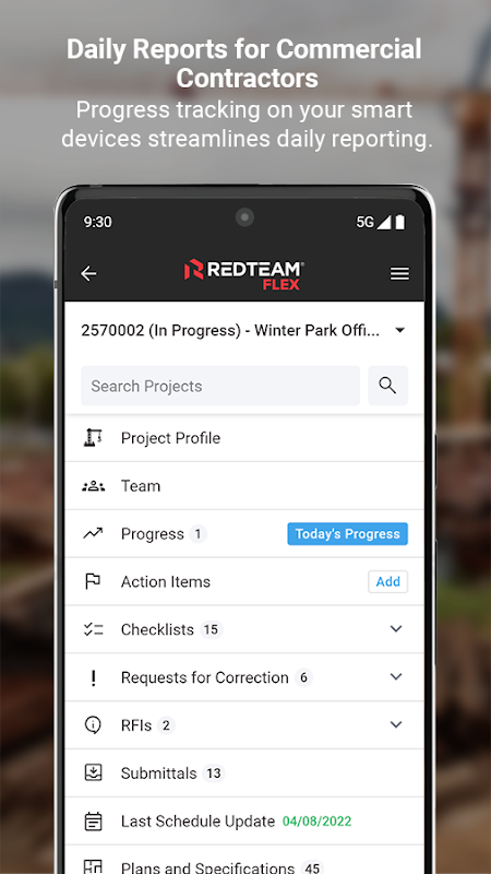 RedTeam Flex for Android is fully integrated with RedTeam Construction Project Management and Accounting Software on the web, enabling users to create and share progress, expenses, and punch photos from mobile devices. RedTeam Flex enables construction teams in the field to create daily progress reports, access construction documents, and collaborate with owners, architects, and other contractors on the go.