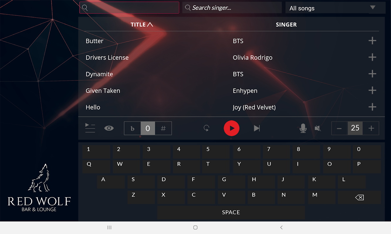 This app is functioned as a remote control to select song, pause, play, change sound volume, and manage playlist from a 10 inch Android tablet. This app is created for Red Wolf Karaoke premises.