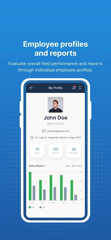 ● Employee profiles and reports- Evaluate overall field performance and reports through individual employee profiles.