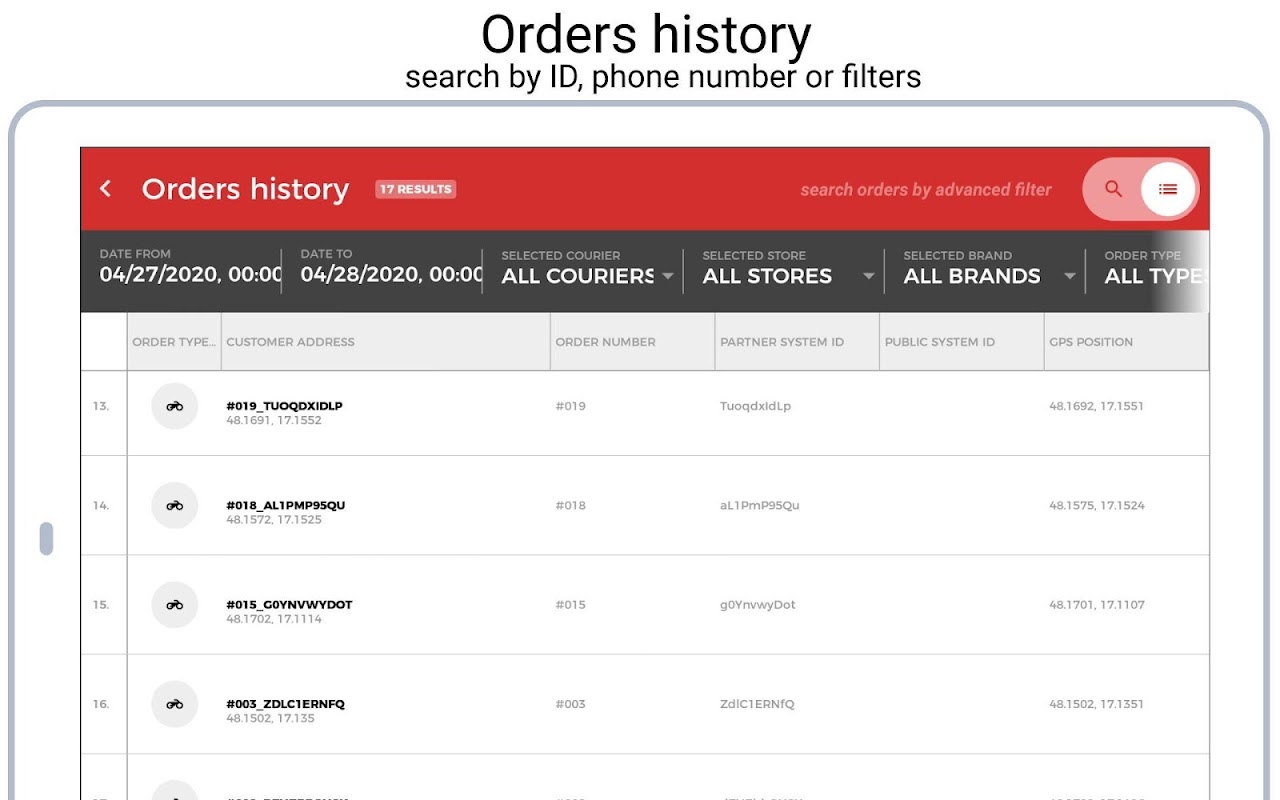 • Orders history - searching orders by ID, phone number or other filters