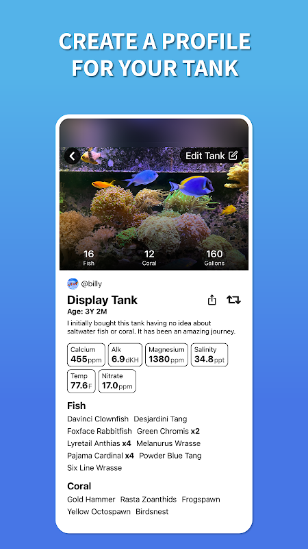 - Personalized Tank Profiles: Craft personalized profiles for each of your aquariums, meticulously logging diverse inhabitants and precise water parameters. This streamlined aquarium log showcases your aquatic havens and provides valuable insights to others in the community.