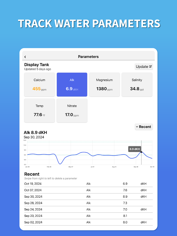 - Parameter Tracking: Monitor your reef tank's water parameters effortlessly. Visualize your data in intuitive charts to maintain a thriving saltwater ecosystem.