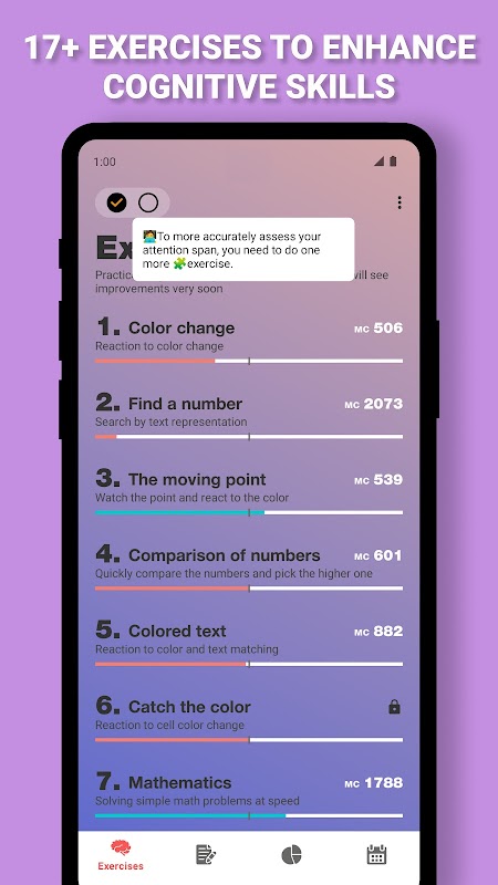 ⏺ Intelligent brain exercises tailored to enhance focus, mental quickness, mathematical skills, problem-solving abilities, and attention.