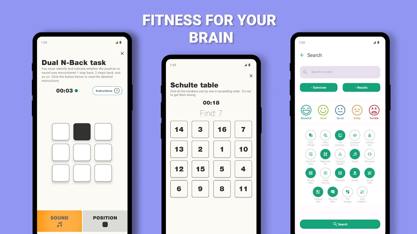 On the main screen you are offered a set of exercises, select an exercise and its description will open. Click the strat button and begin the exercise. The program will ask you to perform a series of two approaches, this is done to more accurately assess your cognitive abilities and reduce the error in the calculations. After completing the exercise, the app will evaluate your result and show your progress on the statistics tab.