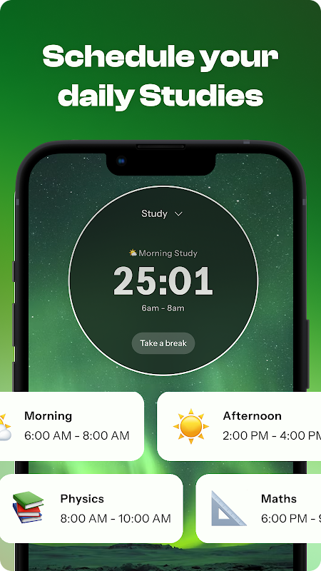 The timer is the core of staying on task. It runs with focus-friendly music while blocking distracting apps and menus so you can work without interruptions. By default sessions start at 25 minutes, but you can adjust the hours and minutes before tapping Start.
