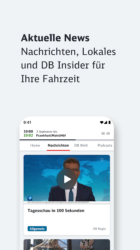 The infotainment area offers regional information, a cutting-edge news mix and other articles on knowledge and entertainment. Here you can access an extensive multimedia offering from our many partners. In addition to the DB mobil content, you will find numerous podcasts, short language course units or exciting knowledge articles - ideal for making sensible use of your travel time. If there is a WiFi connection on regional trains and S-Bahn trains, you can access the content directly from the train servers and do not need mobile phone reception.