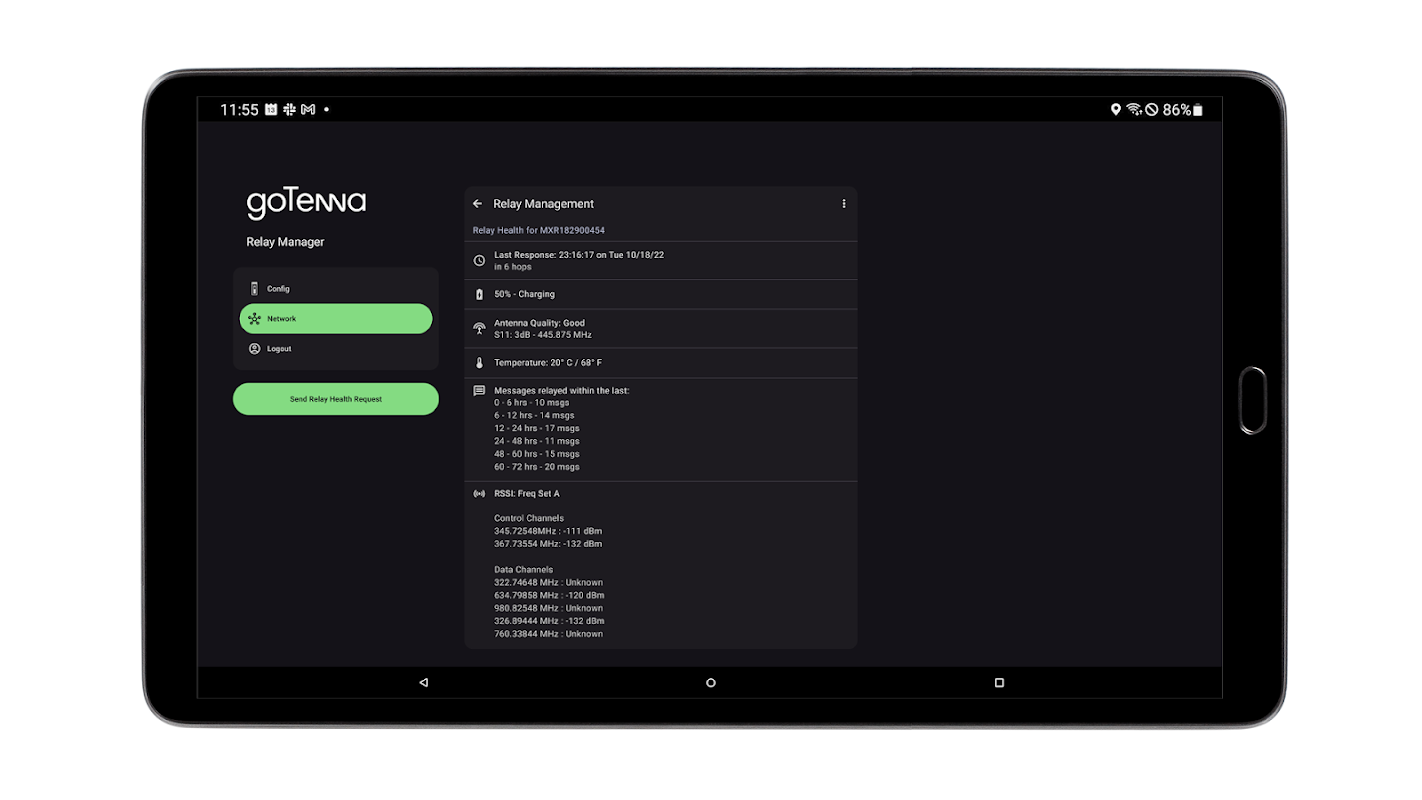 Full Description: *REQUIRES RELAY HEALTH CHECK PREMIUM LICENSE* The goTenna Relay Manager App empowers users to remotely check the health of relays on their goTenna Pro mesh network. Once connected to a goTenna network, a Health Check Request can be sent which will trigger a response from relays on the network. The response will report: