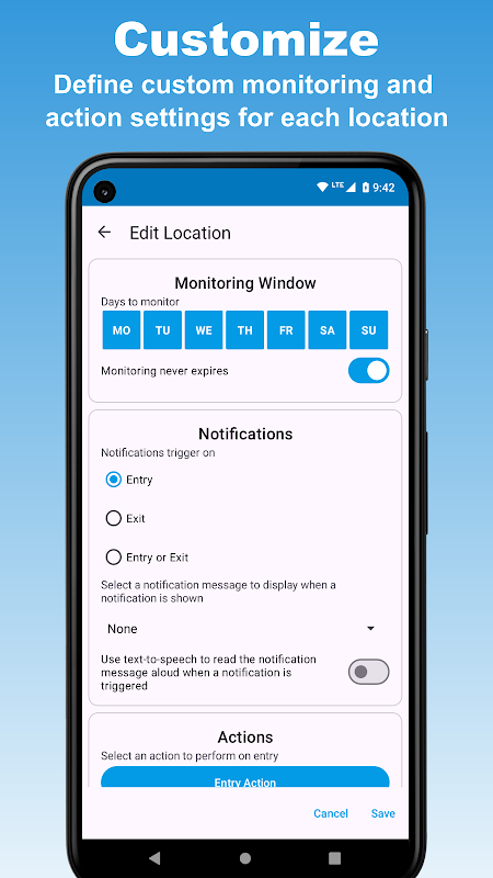 Actions and notifications are highly customizable. They can be triggered once or whenever a user enters or exits a location. Users can define what days of the week, and what time of day to monitor a location for events. Locations can also have a set end date to when to stop monitoring.