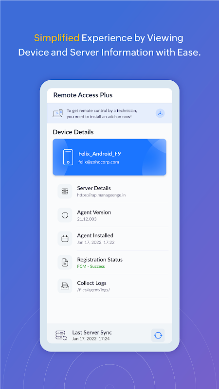 Remote Access Plus Agent app enables Android mobile devices in your company to be secured, provisioned, and remotely managed. IT admins and technicians can now easily troubleshoot your mobile devices remotely with or without physical intervention.