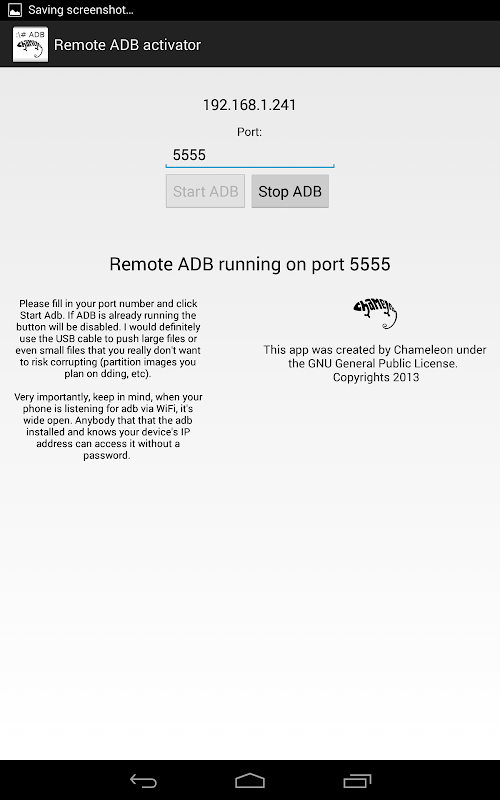 To get started using ADB remotely just fill in your desired port number (default is 5555) and hit Start ADB. ADB will now be running on the device. It will show the ip of the device on the top of the screen.