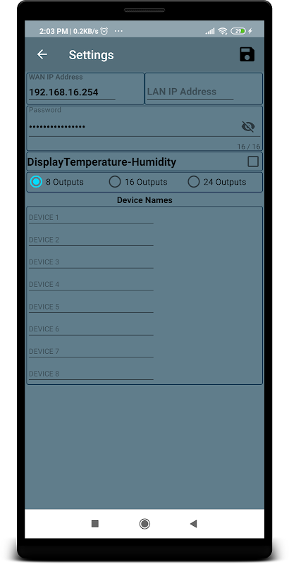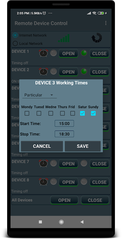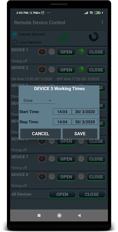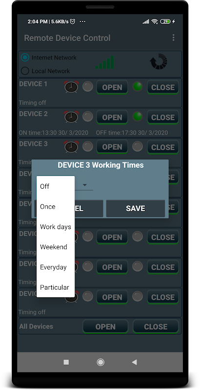 You can control your 8-16-24 channel relays over internet/network with Android App. You can set the operating hours of the relays independently(For 8 channel).