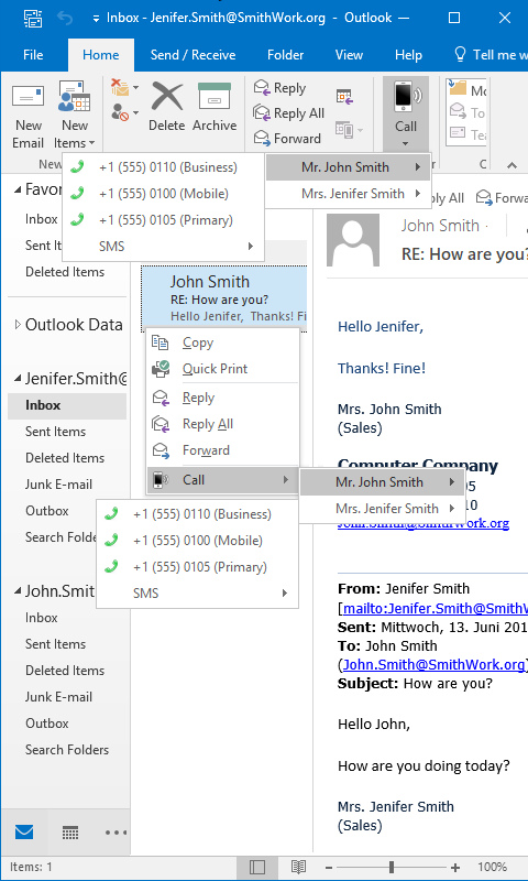 - Allows calling email sender and recipients with help of contact information (Outlook)