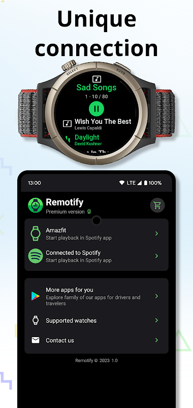 Premium version of Remotify enables you to manage your favorite songs in Spotify app and start playback of song or playlist right from your Amazfit smart watch.