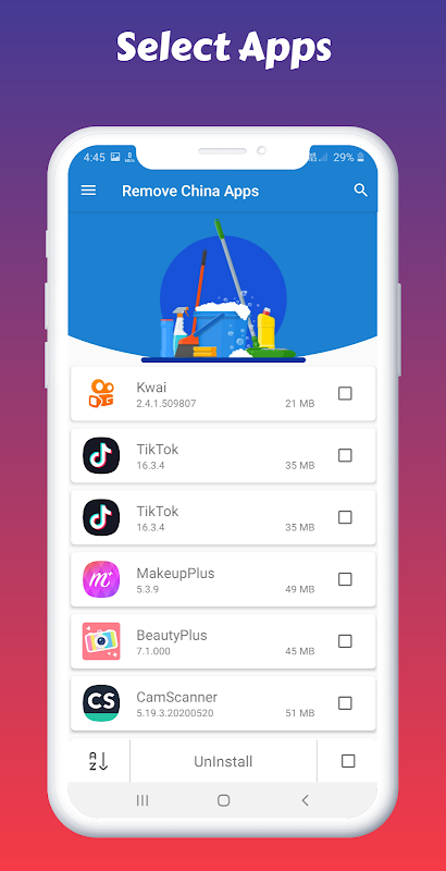 It is very easy to find Chinese apps and uninstall that, This tool lists all Chinese apps. You can easily remove selected apps. Chinese apps are not secure you can scan and select Chinese apps that you want to uninstall, and click 'Delete' button to uninstall them. We do not force to uninstall any app. This is your choice to keep or uninstall the app.