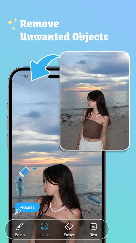 With this application you can remove unwanted object of photo, you can eraser person, eraser object, eraser sticker or text on your photo. It's all free!