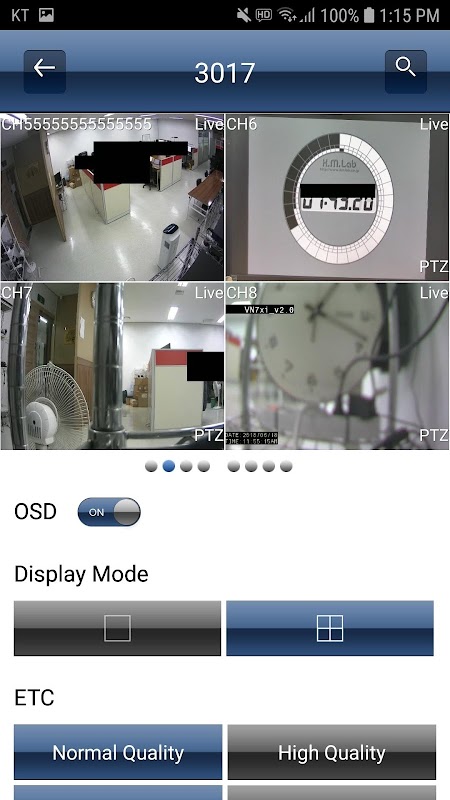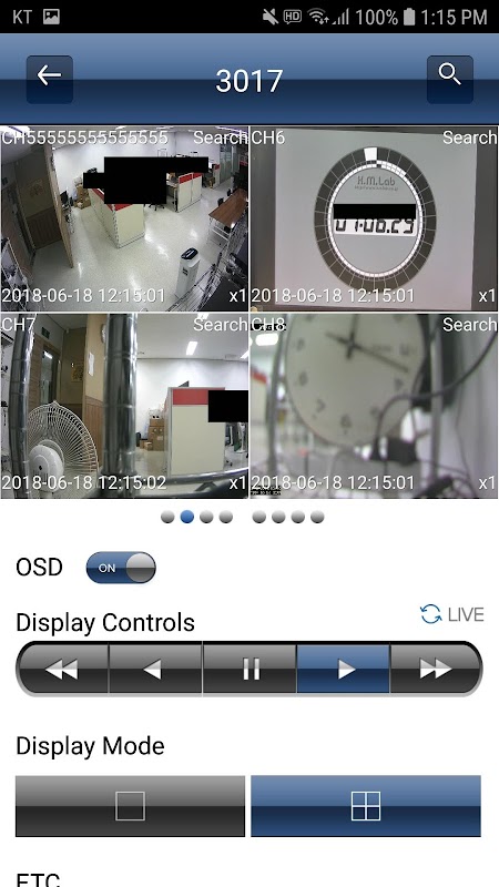 individual cameras or split screens of multiple cameras can be viewed. PTZ cameras can be controlled.