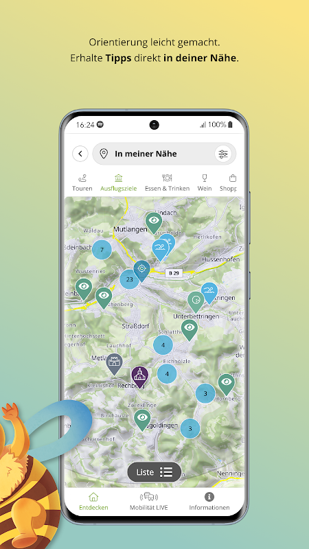 Simply share your location and the REMSTAL app will present you with leisure options within a radius of approx. 25 km. Browse for excursion destinations, hiking and cycling tours, refreshments and shopping opportunities as well as events in your area - together with the real-time data from public transport, you can skilfully move to the destinations of your choice in the Remstal. Of course, there is also information about opening times and prices and, on top of that, many insider tips for your unforgettable break in the Remstal. You can also book tickets for selected events here.