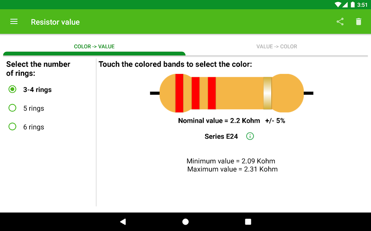 It allows you to calculate the resistance value by entering the color code of the rings, or from the value of a resistance it allows you to know the color code of the resistance.
