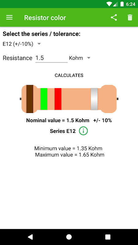 A check is performed on the correctness of the calculated resistance value and if not available for the selected series, it informs in which series it is possible to find it or it signals that the value entered does not exist on the market.