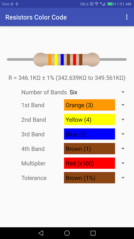 Provides resistor value given its color code. Complete, including tolerance! There is a graphic interface to show 4, 5 and 6 color bands.