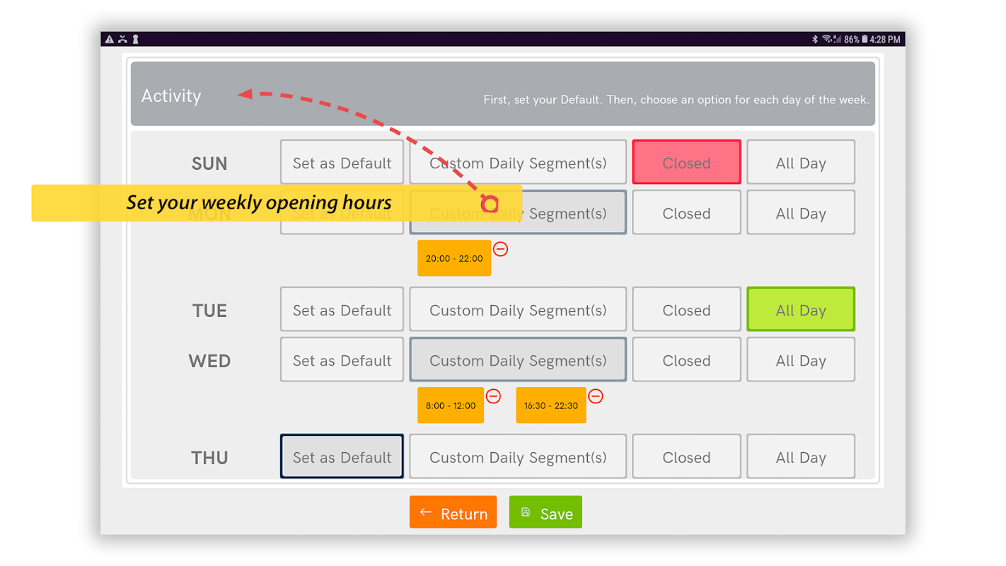 9. Customize Weekly Activity - When are you open? When are you closed?