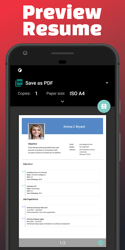 Easy PDF Creation: Generate PDF resumes instantly with our built-in PDF engine. Share your completed resume directly via email or save locally for future use.