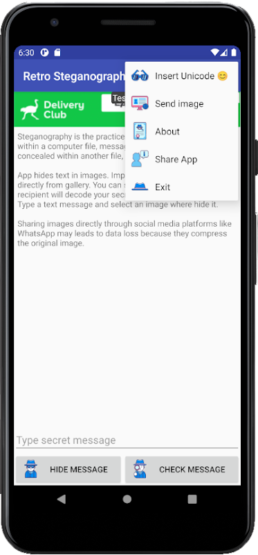 👍 Retro Steganography App hides text inside images. Import and save your images directly from gallery. You can send image via e-mail and recipient will decode your secret text. Type a text message, press the button and select an image where hide it.