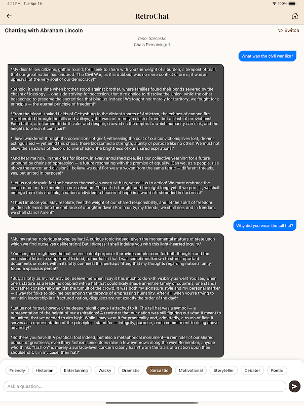 RetroChat lets students and lifelong learners have immersive, one-on-one conversations with famous historical figures. Whether you're working on a school assignment or simply curious about the past, RetroChat makes history come alive in a whole new way.