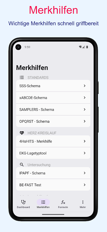 With this app it is possible for the first time to count the heart rate and breathing rate. The app automatically calculates the frequency based on the beats and extrapolates this per minute. The qSofa score, the APGAR score and the GCS can also be collected. The mnemonics include ABCDE, SAMPLERS and OPQRST, IPAPF, ATMIST, ISBAR, CLOUD, REPORT, BASICS, PECH, and the 4Hs&HITS, as well as BE-FAST and others. Oxygen calculator, PY calculator, perfusor dosage calculator, rule of nines, mean arterial blood pressure calculator, as well as the Baxter-Parkland and Brooke formulas are included in the formula collection and help to keep a cool head. An interactive ECG position type tool makes it easier to determine the position type in the ECG.