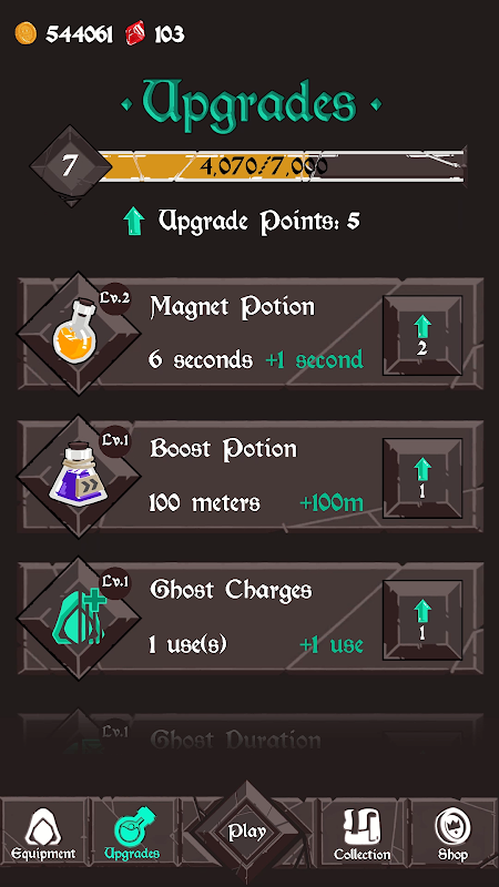Spend your experience or rubies on upgrades for your character!