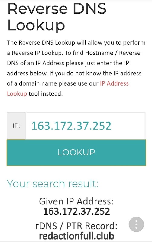 Reverse IP lookup / Reverse DNS Lookup / PTR Record Lookup / IP to Hostname