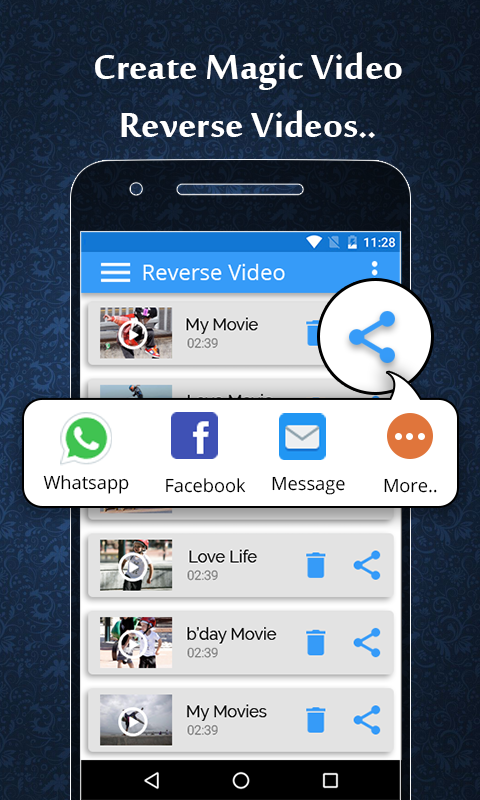 In This video you’re all the photos or your action is reverse and also you share this Reverse Video with your friends or families through social app.
