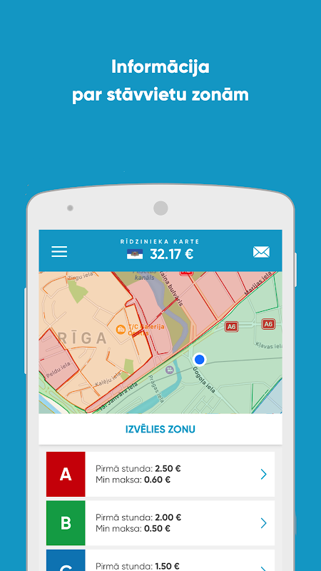 Riga Card allows you to pay for parking in Riga in zones A, B, C, D, R, J and V. By connecting Riga resident's card parking in zones B, C and D is with 20% discount.