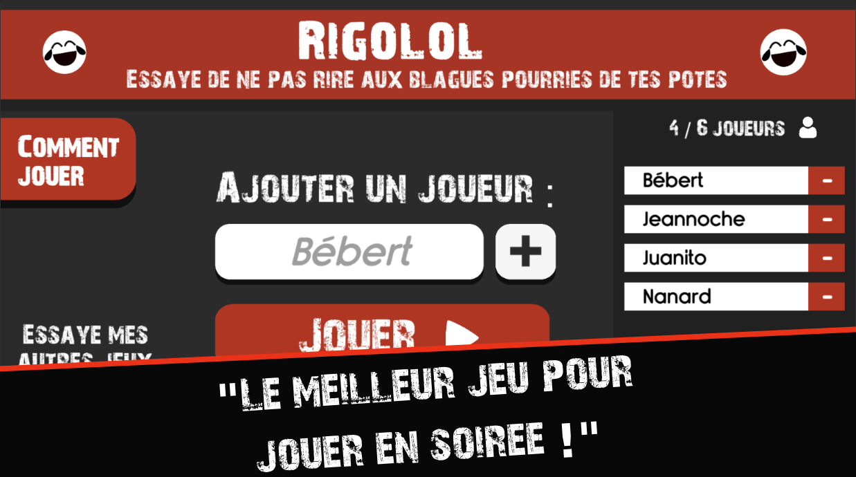 RIGOLOL is the ultimate funny game between friends, ideal for livening up your evenings. Inspired by famous dad jokes and the “you laugh, you lose” concept, this evening game with friends guarantees memorable laughs.