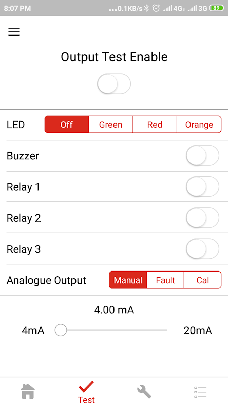 • Maintenance (test LED/buzzer operation, relays and analogue output level.)