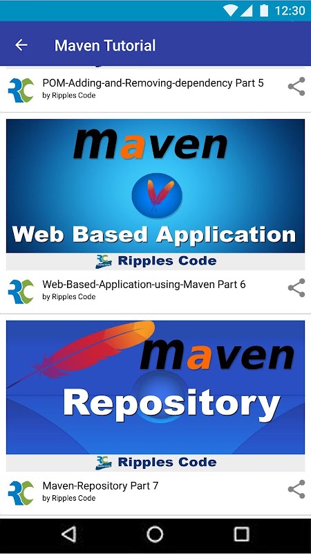 Welcome to the World of FREE Software Training Video Tutorials. Ripples Code app is designed to train you on various technologies like: JavaFx,Jasper Report,Maven, JSF and many more trending technologies.