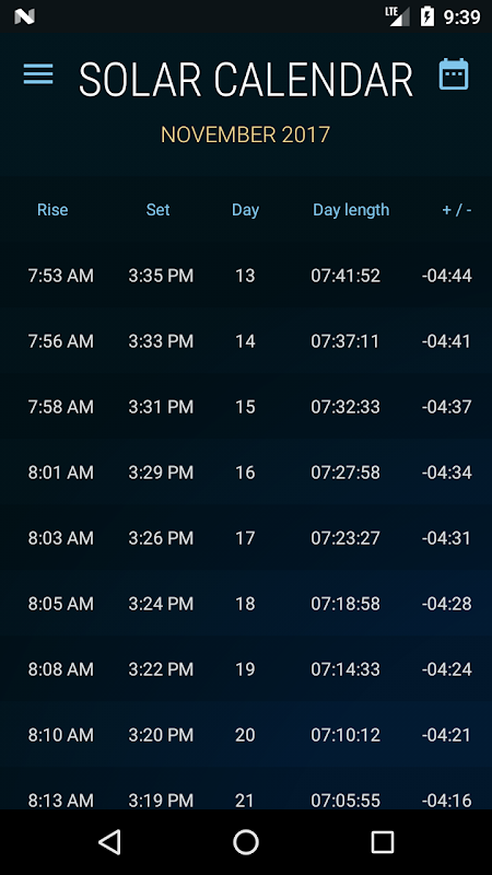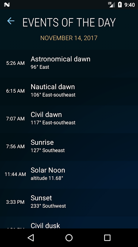 ◾ Time of civil, nautical and astronomical twilight, sunrise and sunset, solar noon and midnight. (The azimuth is indicated for all events except of the solar noon)