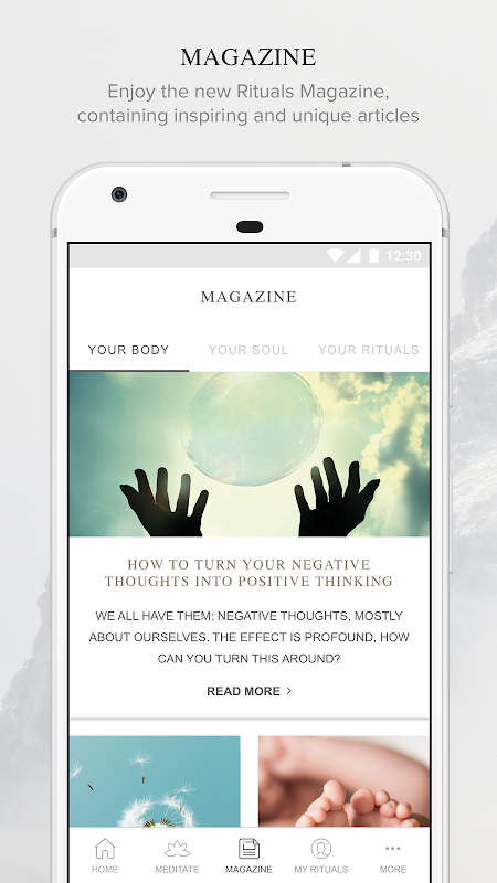 Discover our new magazine: your daily dose of inspiration, helpful hints and recipes. Create a moment for yourself with our relaxing meditation and yoga videos—we’ve even added some simple exercises specifically for beginners. The new design is easy to navigate, with a homepage that allows you to browse quickly and updated shopping screens that make buying a breeze. It also includes a store locator to help you find your local Rituals store, as well as a wishlist function where you can save all your favourite products. Download the Rituals app and slow down, relax and most importantly, enjoy!