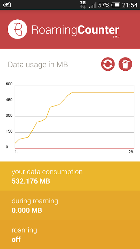 Displays your data consumption in a graph separated to the roaming consumption and the total data consumption.