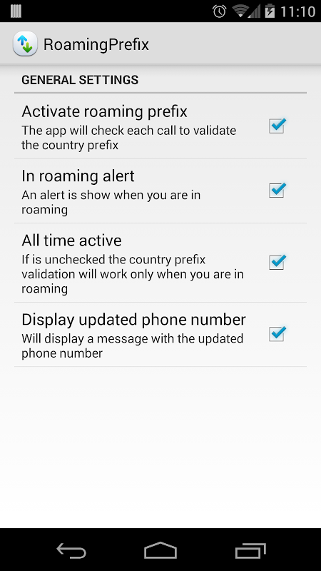 - "All time active" – Whenever this option is active, the application will validate numbers with the country code even if NOT using a roaming service. If this option is deactivated, the application will take action only when using a roaming service.