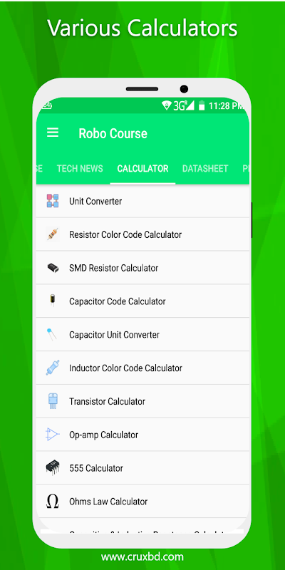 This app is an absolute all in one learning app for robotics, electronics, IoT, Drone making, programming, etc. We are frequently adding more courses. You will be notified about the latest tech news in TECH NEWS section. Besides this, it has tons of electronics calculators, thousands of electronic component datasheet collection, lots of pinout, resources for electronics, etc.